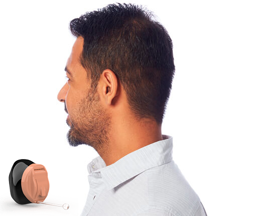 Aparelho auditivo personalizado que se ajusta ao canal auditivo. Pequena parte aparece por fora da orelha.